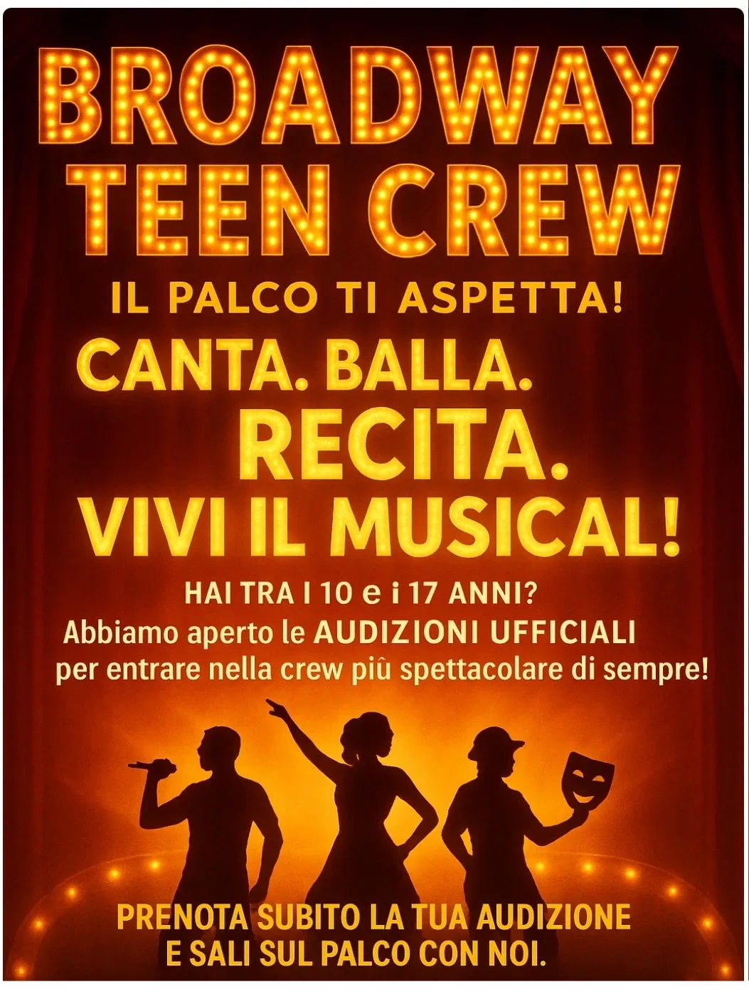 Hai tra i 10 e i 17 anni e sogni di esibirti su un vero palco? Entra nella Crew del Musical più spettacolare di sempre! Vivi l'emozione del palco, lavora con professionisti del settore e costruisci insieme a noi uno show indimenticabile. AUDIZIONI UFFICIALI APERTE! Prenota ora la tua audizione gratuita